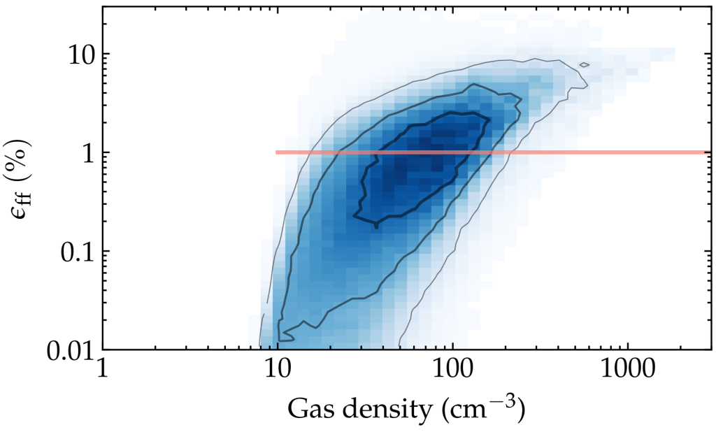 Distribution of local star formation efficiency predicted in the above simulation. The turbulent star formation model naturally predicts a sharp density threshold with star formation occurring only in dense gas. Also, the model predicts the average value of efficiency of ~few % per freefall time which is similar to the values observed in real star-forming regions. The model also predict a strong variation of efficiency compared to a typically assumed constant efficiency in dense gas (illustrated by the red line).