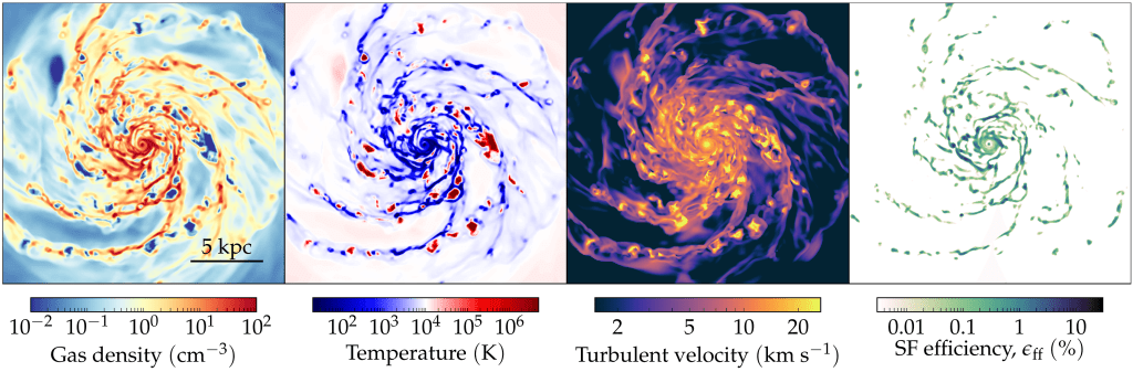 Isolated galaxy simulation with explicit modeling of unresolved turbulence. Predicted turbulent velocities on unresolved scales (3-rd panel) can be used to compute star formation efficiency in each computational cell (4-th panel). This approach is conceptually different from that used in almost all previous galaxy formation simulations which typically assume a constant efficiency in space and time.